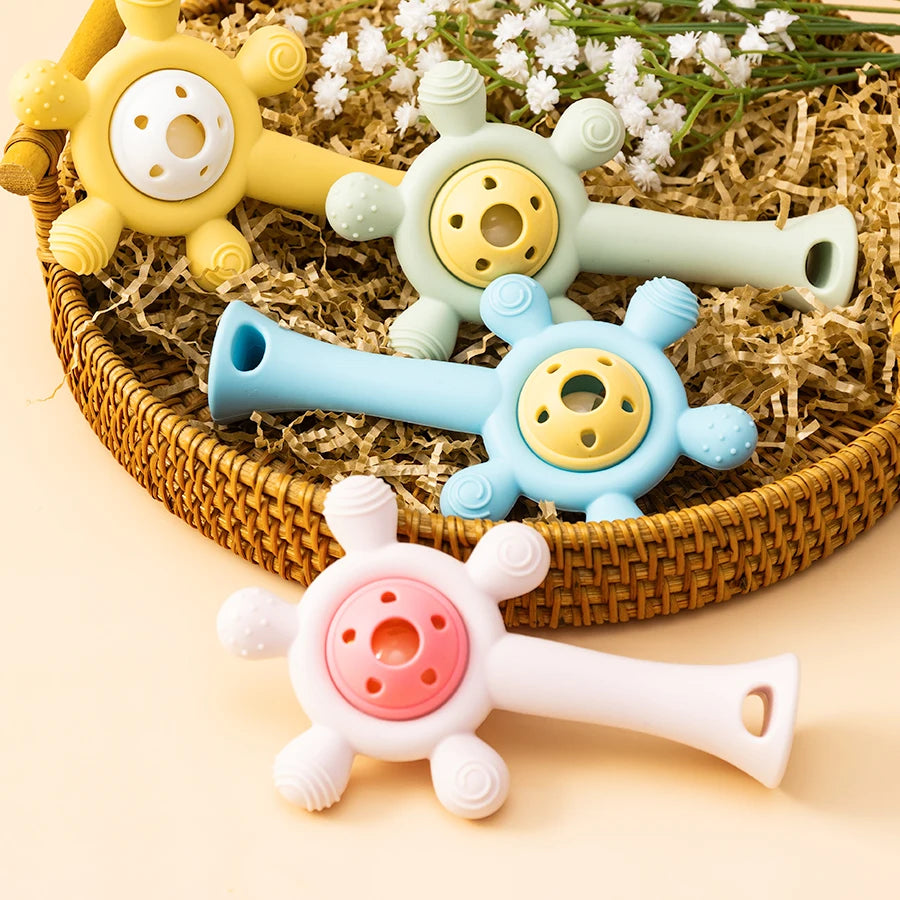 This soft silicone teether toy is designed to soothe your baby's gums while providing safe and engaging play. Its cute sky wheel shape and vibrant colors capture your baby's attention, encouraging sensory development. Made from gentle, non-toxic materials, it’s perfect for little hands to hold and chew on, helping to ease discomfort during teething. Ideal as a comforting accessory, it supports your baby's growth with both fun and function in mind.