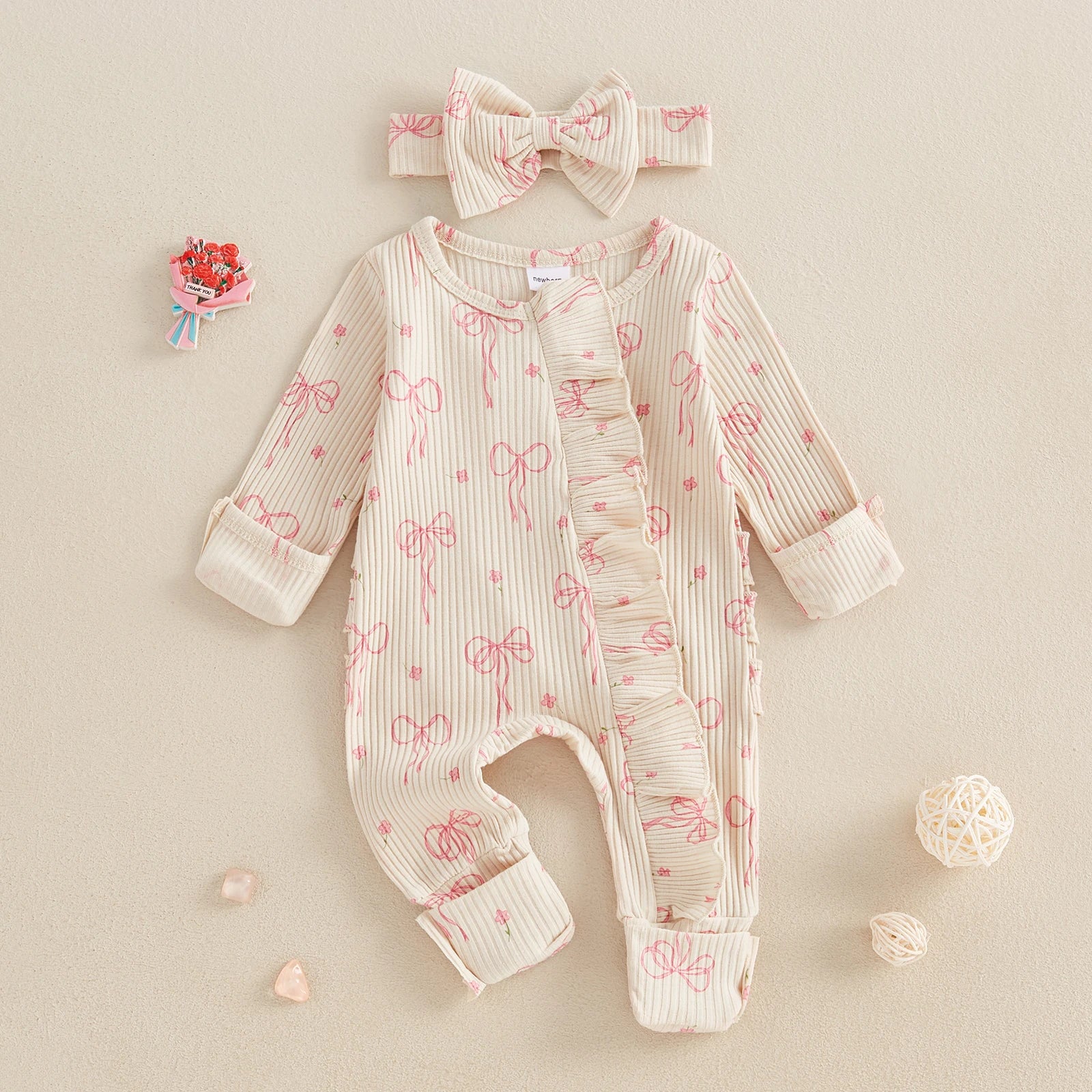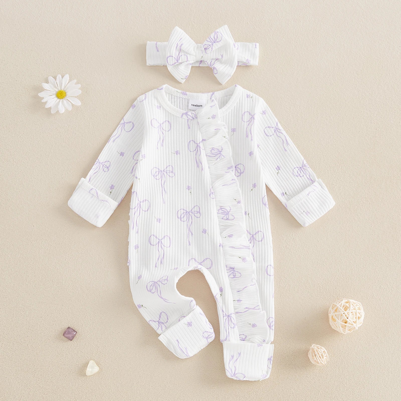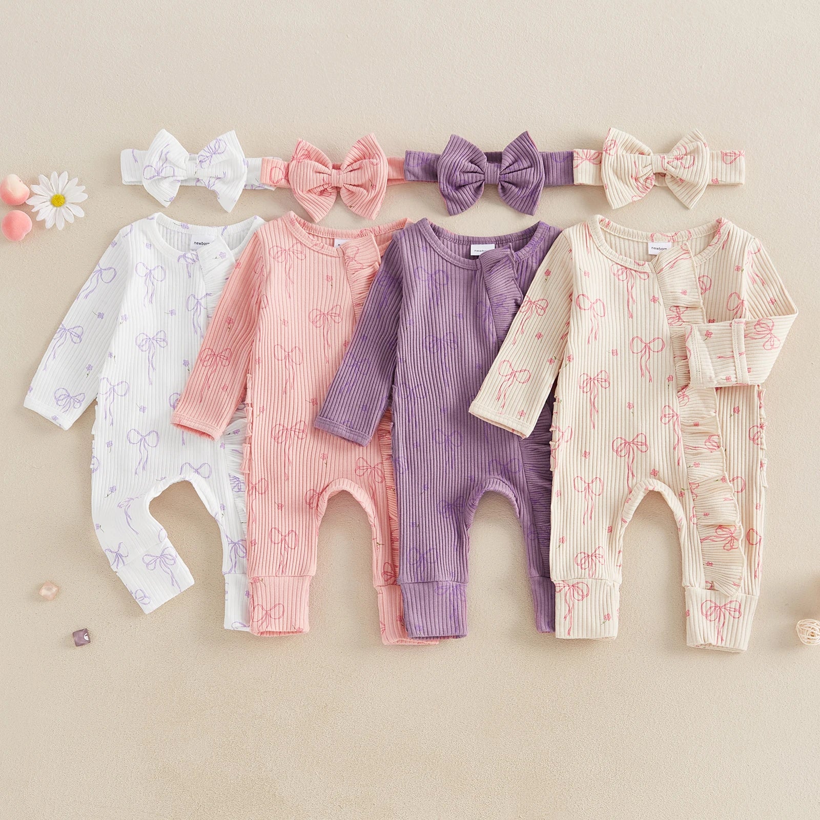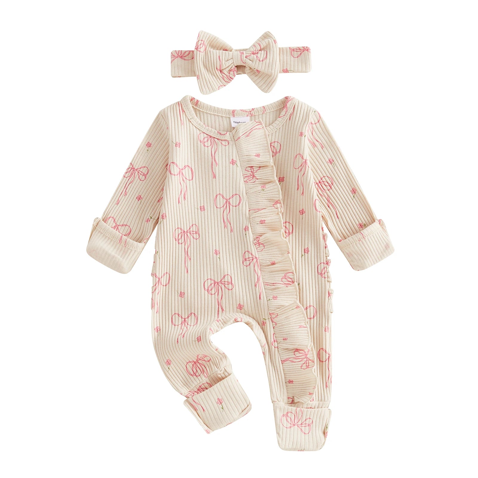 FOCUSNORM 0-6M Newborn Baby Girl Boys Fall Romper Sets 2pcs Bow Long Sleeve Full Length Zipper Front Ribbed Jumpsuit Headband