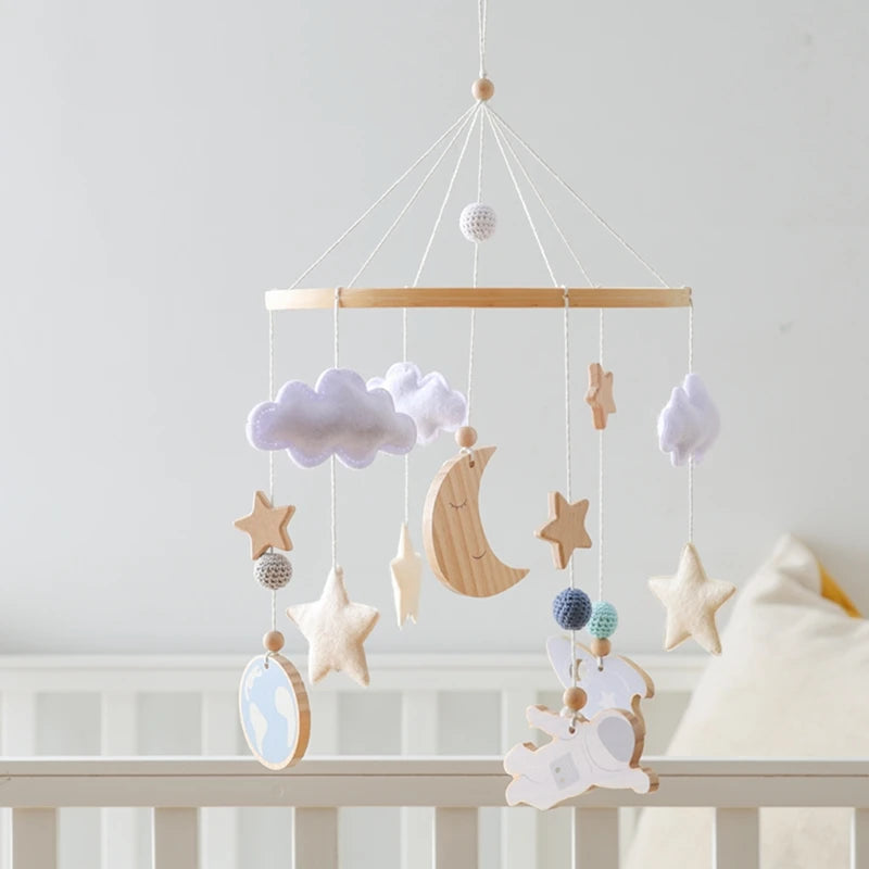 This wooden crib mobile holder features charming moon, stars, and astronaut rattles that gently entertain and comfort your newborn. Designed to easily attach to the crib, it provides soothing sounds and movements that help create a peaceful sleep environment. An ideal gift to support your baby's early development and promote restful nights.